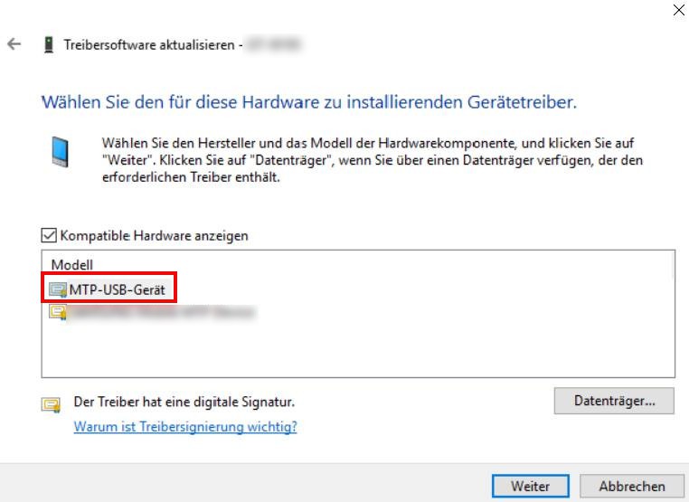- Click in the list on the "MTP USB device" and confirm with "Next". Then install the correct driver, and your device is as usual suitable.