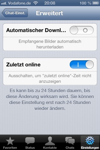 - Online Status hide: Since WhatsApp stores always have the time of your last stay in the App, feel many users are spied on and monitored. This "Last online"feature, you can disable on your iPhone in the "settings" under "Account" and "privacy". Now you can't see when others were last online.