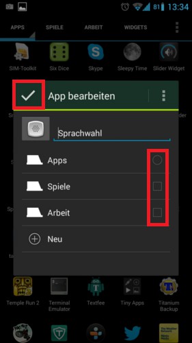 - In this menu, you can choose the Drawer-groups of the Icon is to be displayed. Remove all the hooks, and confirm with the checkmark to the left at the top.