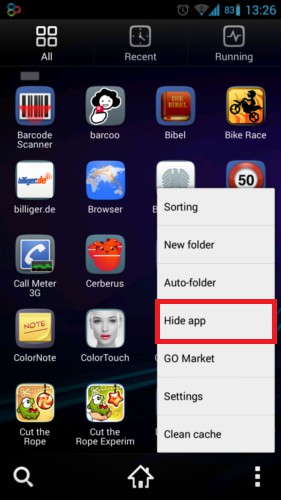 - Here you will find the menu-item "Hide app". Tap on it and select the App you want to hide.