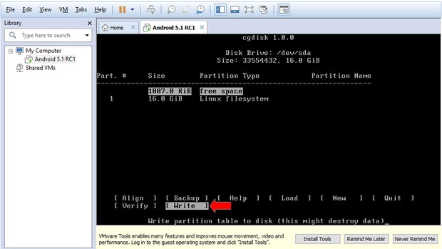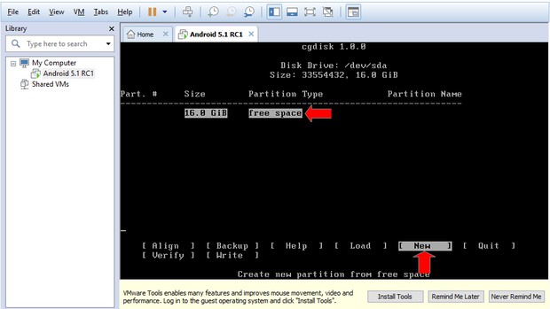 - The VMWare virtual hard drive must be designed for the Android part and formatted. To do this, select "Create/Modify partitions" and answer the following question with "Yes".