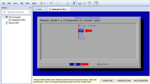 - Currently, the supported file system ext3, ext2, ntfs and fat32 of Android 5.1 RC1. We recommend ext3 as a quick and safe file system. Confirm the selection with "OK" and start the formatting of the VMWare virtual hard disk with "Yes".