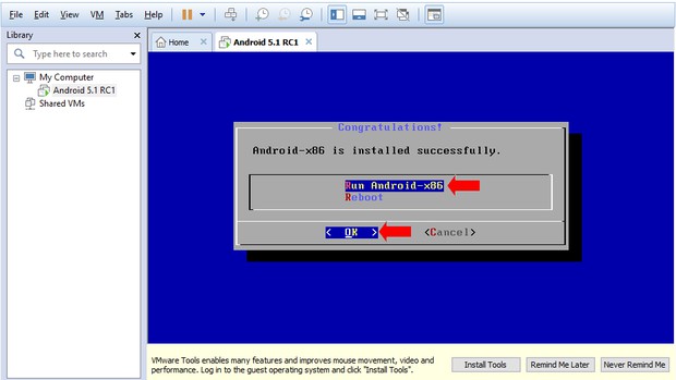 - After a successful Installation, you can launch the Android operating system with the "Run Android x86" and "OK".