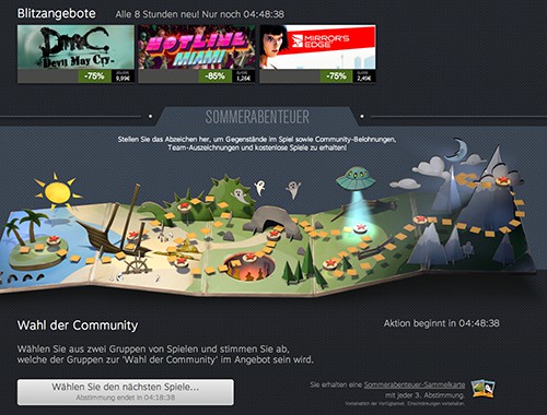 Something different is the so-called flash work offers: These change every 8 hours and can be influenced by you as a Steam user directly. Because you have as a logged-in Steam users the opportunity to choose between two different Offers, each with four to Play. The choice with the most votes will then be offered for 8 hours also on the home page (further down).