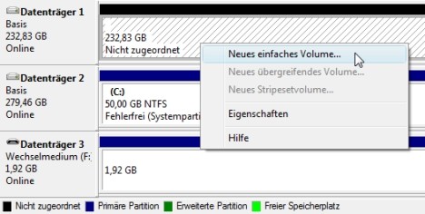 - Click with the right mouse button on the Unallocated space and select [New simple volume] (cf. Screenshot).