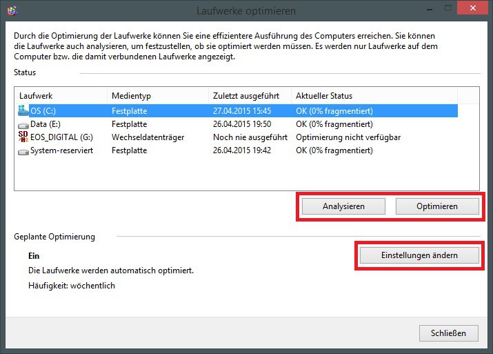 - Perform the optimization for each of your drives. Depending on how long the last defragmentation is, this can take a few minutes.