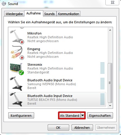 - In the list, locate the entry for your headset, and set this also via the Button "set As default".