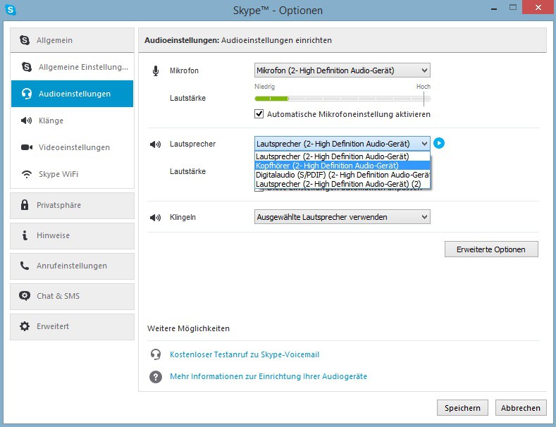A common Problem is that the sound from Skype continues to be another speaker. This is in the settings of Skype to teach:
