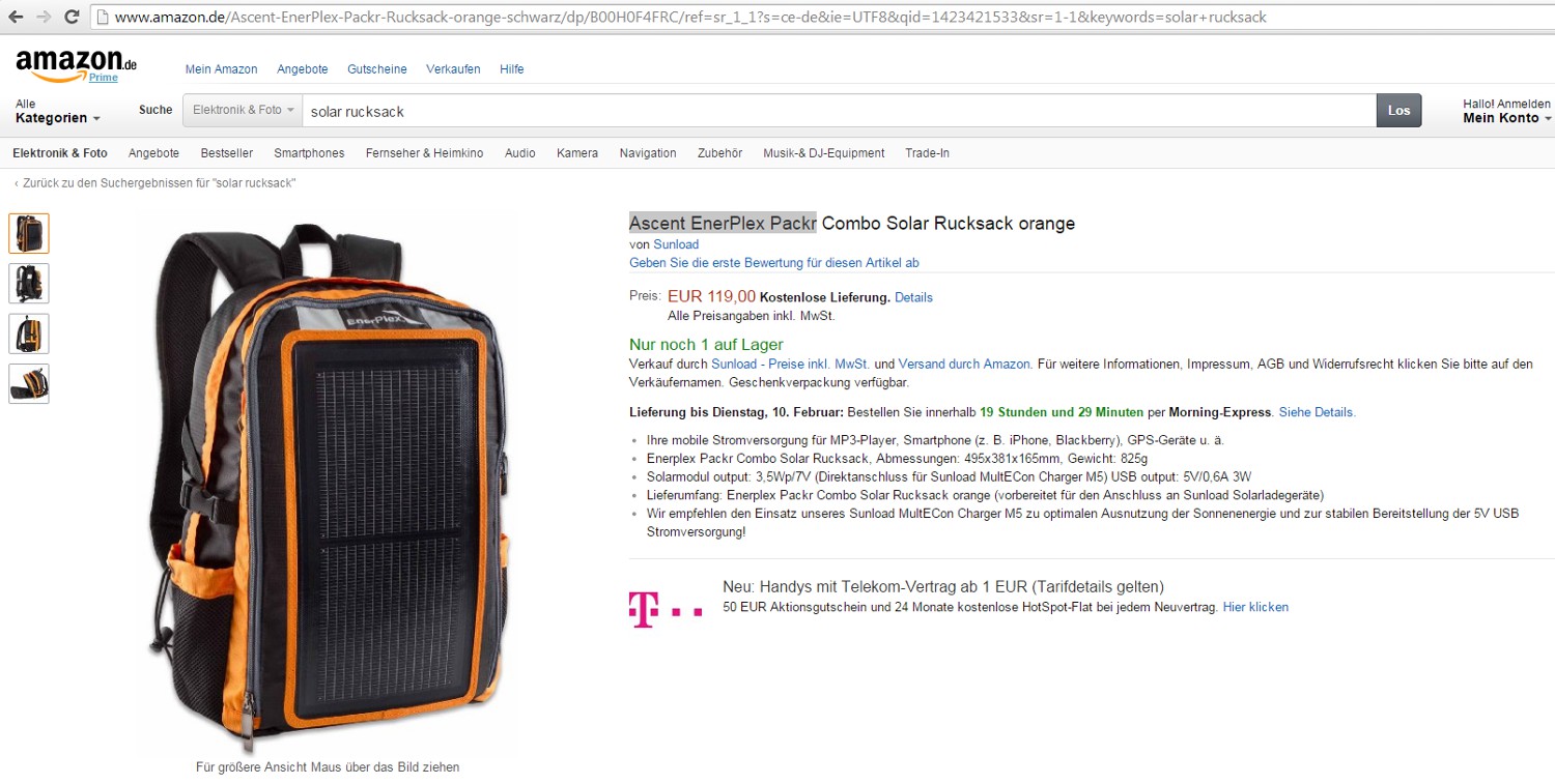 - Price: approximately 120 Euro cost of the Ascent EnerPlex Packr is not more than a Solar Charger and a good backpack.