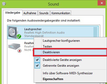 - Under the "playback" tab you will find usually several devices, among other things, the "speaker". Click with the right mouse button and select "Disable", the sound output to turn off their Notebook speakers.