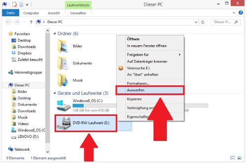 - Windows: Press simultaneously the keys [Windows] and [E], so that the Explorer opens. Click on the drive with the right mouse button and choose the Option "eject".