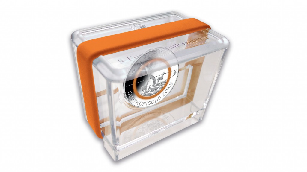 The orange colored polymer ring attracts the attention of the year's 5 Euro coin on themselves. But the combination with the copper-Nickel alloy makes the coin a real world novelty. It is, therefore, tamper-proof and resistant against heat, cold, water, chemicals and UV rays. Just like its predecessor, also the orange coin, is called "Subtropical Zone", with a diameter of 1.5 mm larger and 0.5 grams heavier than a conventional Two-Euro coin.