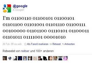 - In February 2009, tweeted Google's "I'm 01100110 01100101 01100101 01101100 01101001 01101110 01100111 00100000 01101100 01110101 01100011 01101011 01111001 00001010".