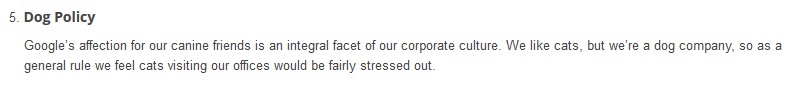 - And Cats? Also something in the code of conduct: Google may also have cats, but because of the "Dog Policy" to stay at home. "We are a dog company," writes Google.