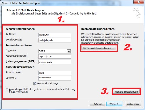 - Via the Button "test account settings" you can check your information for accuracy. It is connected to the account and a Test Mail will be sent.