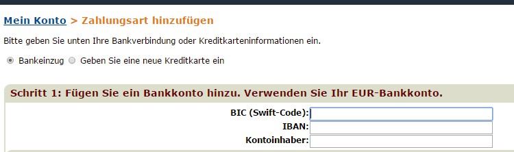 - The options "direct debit from a German Bank account", "Bank proposed catchment of the Austrian account" and "Enter a new credit card".