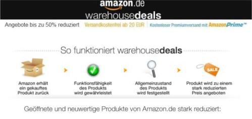 - For some time now, there's the "Warehouse Deals" at Amazon: returns-items will be tested here, and at greatly reduced prices, offered again. The articles are almost always in mint condition and you get the statutory warranty.
