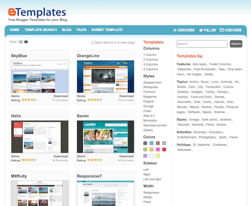 For your own Webblog, there are an almost infinite number of Templates. In BTemplates you can get a great Overview with currently over 400 pages. You can browse the templates with a search box, or according to the number of columns, colors, Styles, or topics to filter.