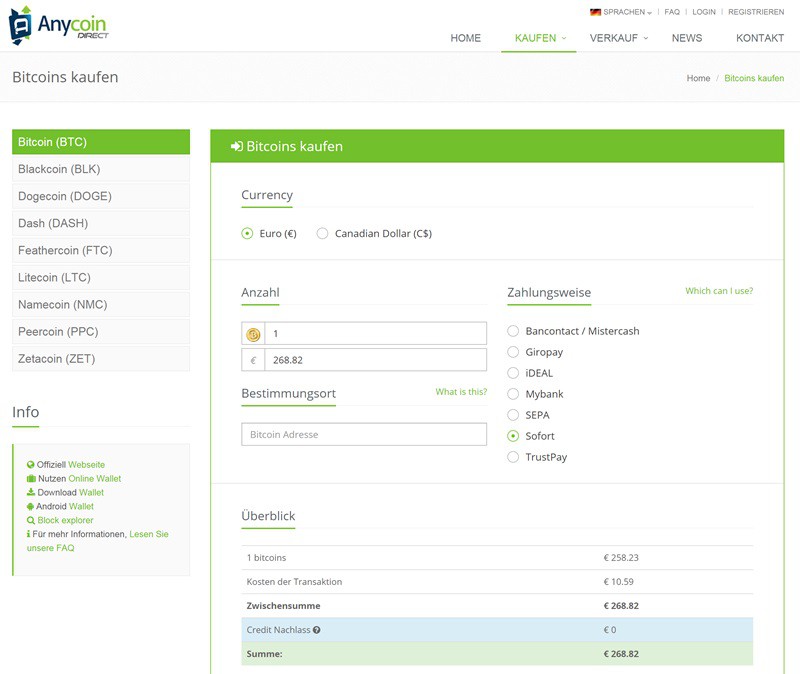 - Also the provider anycoindirect.eu you can buy Bitcoins.