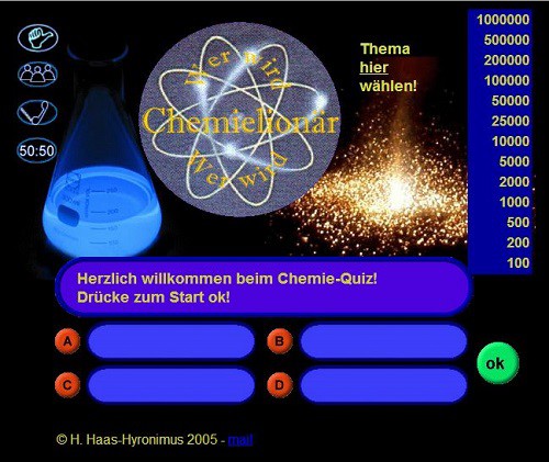 - In addition, you will find chemistry, box the learning game "Who is Chemielionär?". There is a special chemistry Quiz, which is aimed primarily at beginners. The Quiz was created based on "Who wants to be a millionaire?" and looks accordingly (Screenshot). The functions, including the Joker and the profit possibilities are also similar.
