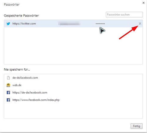 - You move the mouse pointer over an entry. He will now submit slightly bluish under and to the right is a cross appears. Click on the cross, deletes the corresponding password.