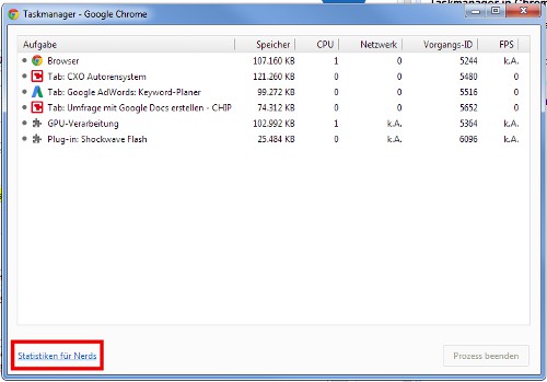 - The Link "stats for Nerds", you receive even more detailed information about each of the Chrome processes.