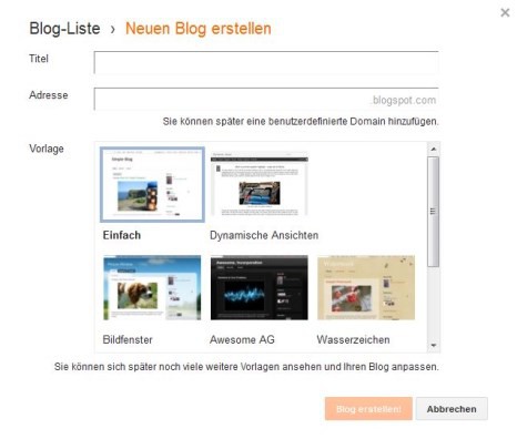 - Enter the title of your new blog as well as your address at Blogspot. Optionally, you can select a Background template for your Blog.