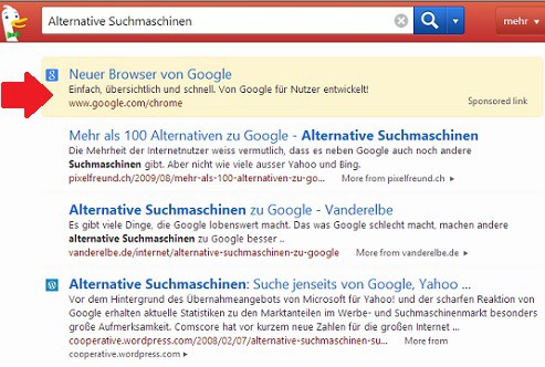 Compared with Google's relatively little advertising on DuckDuckGo. Since the search engine has become popular, has also changed the advertising scheme a bit. Meanwhile, ads for competitors, Google appear (see Screenshot). Nevertheless, the results are largely free of sponsored Links and advertising.