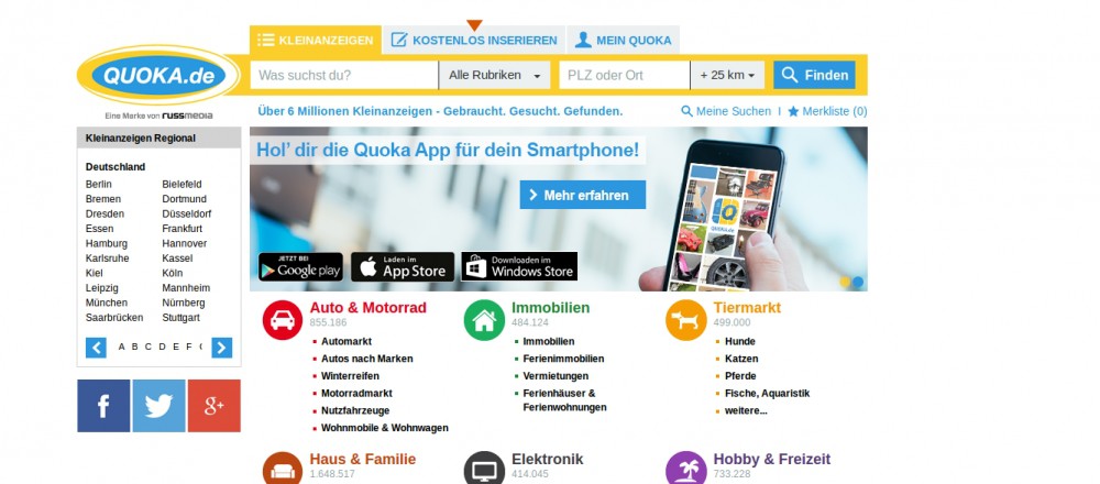 - Quoka offers roughly the same categories as the previous pages. The number of users is the same as the selection is quite high. Here, you can access the web site Quoka.
