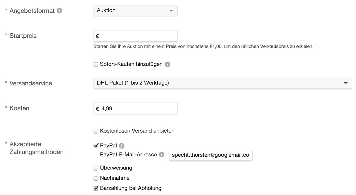 - You can now specify the framework, which should include your eBay auction. Enter the starting price, the duration of the offer and specify the shipping price. Also, check the payment conditions, for safety reasons you should prefer payment by PayPal or cash on collection.