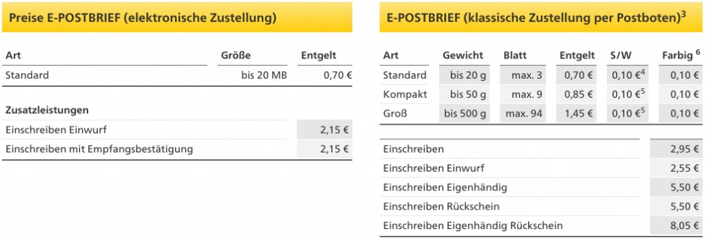 - In the case of electronic delivery of 0,70 Euro fee for a Standard E-mail letter (up to 20 MB) to fall. The additional services "registered mail slot" and a "registered letter with acknowledgement of receipt" you receive for each Euro 2.15.