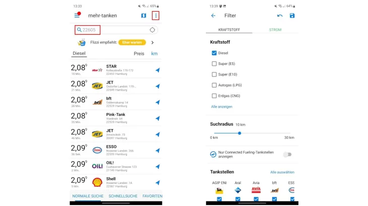 - Here, too, you can use the search bar to enter your location, specify the type of fuel and the search radius.