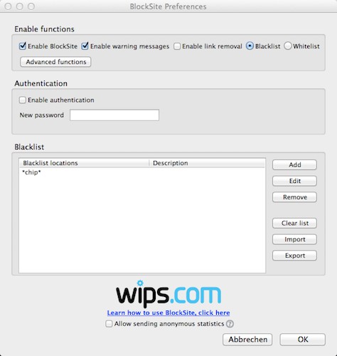 - To Add a new "blocking", click in the next window, click the "Add" Button. Enter in the field "Location" is now the Domain of the blocked Website. By an asterisk (*) you can lock multiple web pages. The Location '*chip* locks, for example,' all the web pages that contain the word "chip". "facebook.*" locks not only facebook.de but also facebook.com. Then click "OK".
