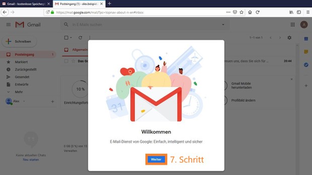 - Then click on the two gray boxes. This allows you to accept the terms and conditions of use and consent to the processing of data. Both is a prerequisite for a Gmail account.