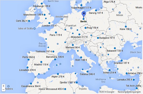 - Berlin to Barcelona: "Google Flights" on the cheapest 60 Euro.