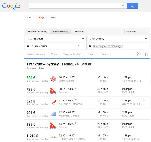 - Frankfurt to Sydney: "Google Flights" best 639 Euro.
