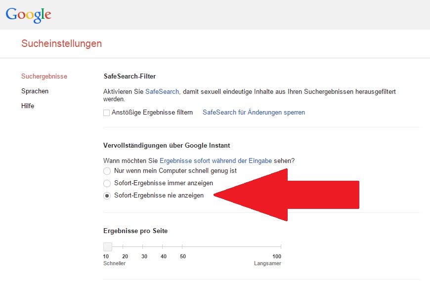 - Open the website google.com/preferences and enable the Option "Instant results never show".