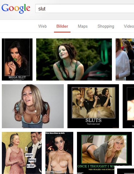 - The search "Slut" shows in the Google recommended Safe-Search-setting "moderate" almost exclusively scantily-clad women. In the case of the "strict" search filter, similar to Bing, all the search results out.