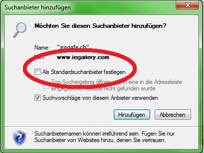 - In the next window, you set the hook "As the default search provider set", so you can really search with your new search engine in the combined Search/address bar of the IE.