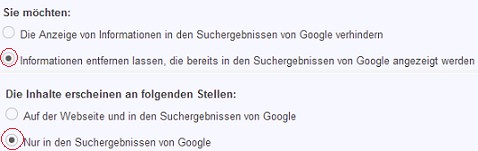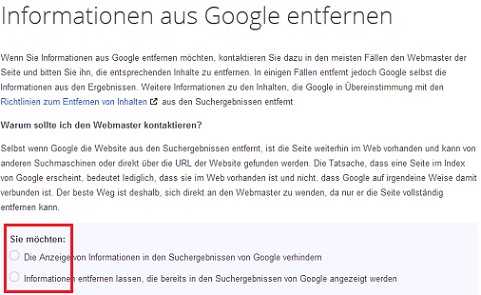 On the [[https://support.google.com/websearch/troubleshooter/3111061?hl=de/offiziellen Support page of Google]] type what you want to do. To remove from search results, you can put a hook at the bottom of the selection.
