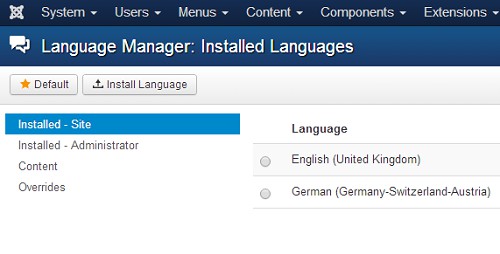 - To activate the German language also in the Admin Panel, click the "Language Manager" left click "Installed – Administrator". Also here you have to click again on the star to set the language as default.