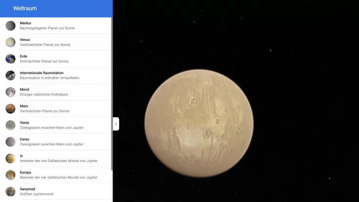 - On the left side you can also inspect other planets and moons by clicking on the three horizontal lines next to Mars.