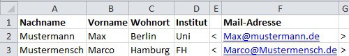 - Enter in the empty field E2 "" (without the quotation marks). The angle brackets define the E-Mail address. Without it, some mail programs do not recognize the E-Mail address.