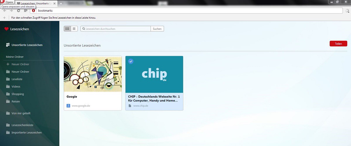 - Bookmark share: - Created bookmarks you can share, more recently with friends. To do this, move the mouse pointer over a bookmark in the bookmarks view and click on the top left on the small hook. Then click on the "Share" Button in the top right of Opera and send the Link via Social-Media networks to your friends.