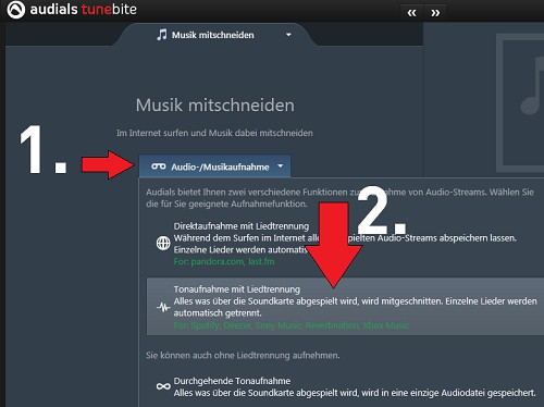- Audials open and go to the tab "music recording".