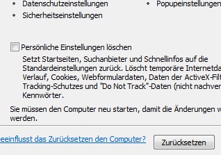 - Select finally, the Option "delete Personal settings" and click on "Reset".
