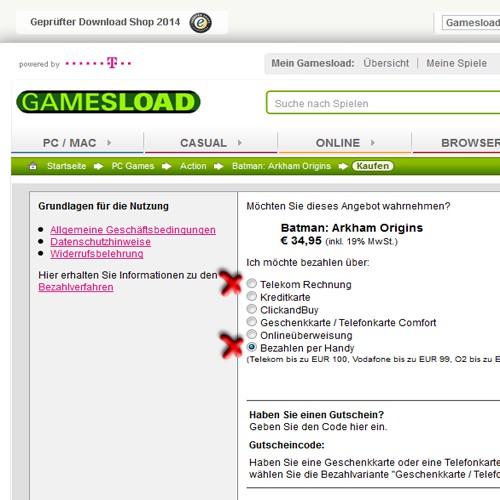 - Game load: Select a game and click on "To purchase". On the next page you can select the payment method. Telecom contract customers can pay via their mobile bill. With the Option "Pay by phone", you can also pay for the Prepaid customers of the Telecom as well as Vodafone, O2 and E-Plus customers make your purchase.