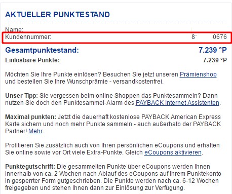 - Website: Have you logged on to payback.de click on "points account". You will find in the middle of your customer number under your name.