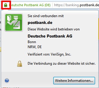 Nowadays, almost all websites that contain sensitive data, such as E-Mails or Bank account details, a [[http://praxistipps.chip.de/http-und-https-wo-ist-der-unterschied_11772/https-verbindung]], SSL-encryption and security certificate. The certificate is displayed, if you click in the address bar of the browser, click the lock icon.