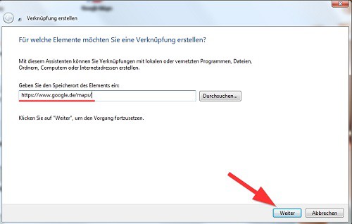 - A new window will appear. In the field "Enter the location of the item:" add the address "https://www.google.de/maps/" (without the quotation marks).
